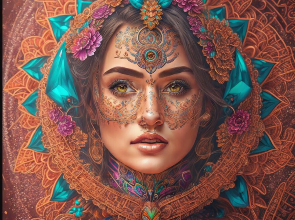 The overall atmosphere of the artwork is ethereal and dreamlike. The interplay of intricate patterns, vibrant colors, and the woman's captivating presence invites viewers to explore the depths of their imagination.