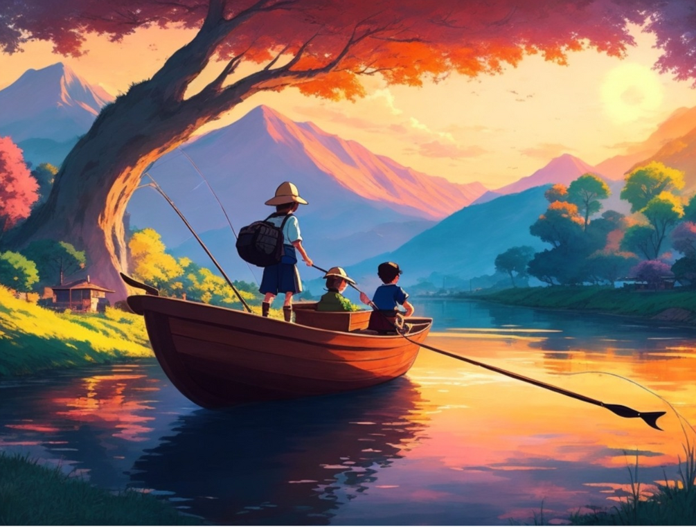 At the center of the artwork, a small boat glides along the tranquil waters, carrying three figures. Their presence adds a sense of human connection to the serene setting, inviting viewers to imagine themselves as part of the journey. The figures sit peacefully, their expressions hinting at a moment of contemplation and appreciation for the surrounding beauty.