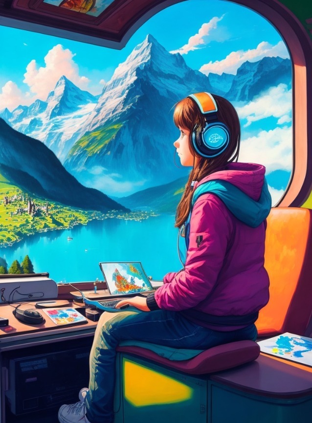 This artwork captures a moment of peaceful solitude, where the girl finds solace and inspiration within the confines of her personal space. The combination of lo-fi aesthetics, the girl's headphone-clad presence, and the captivating mountain and river view creates a serene and introspective ambiance, inviting viewers to embrace the beauty of the moment and get lost in the gentle rhythm of the scene.