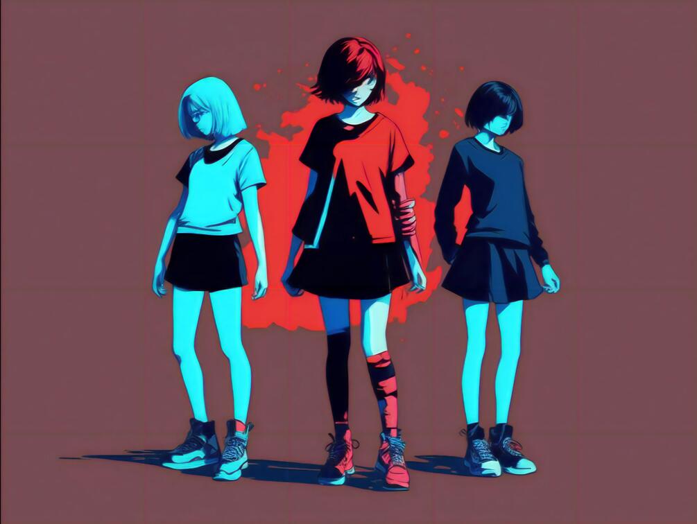 The middle girl stands proudly, donning a vibrant red t-shirt that catches the viewer's attention. The color represents energy, passion, and confidence, reflecting her vibrant personality and strong presence. The red t-shirt adds a dynamic and bold element to the composition, drawing the eye towards the center of the artwork.